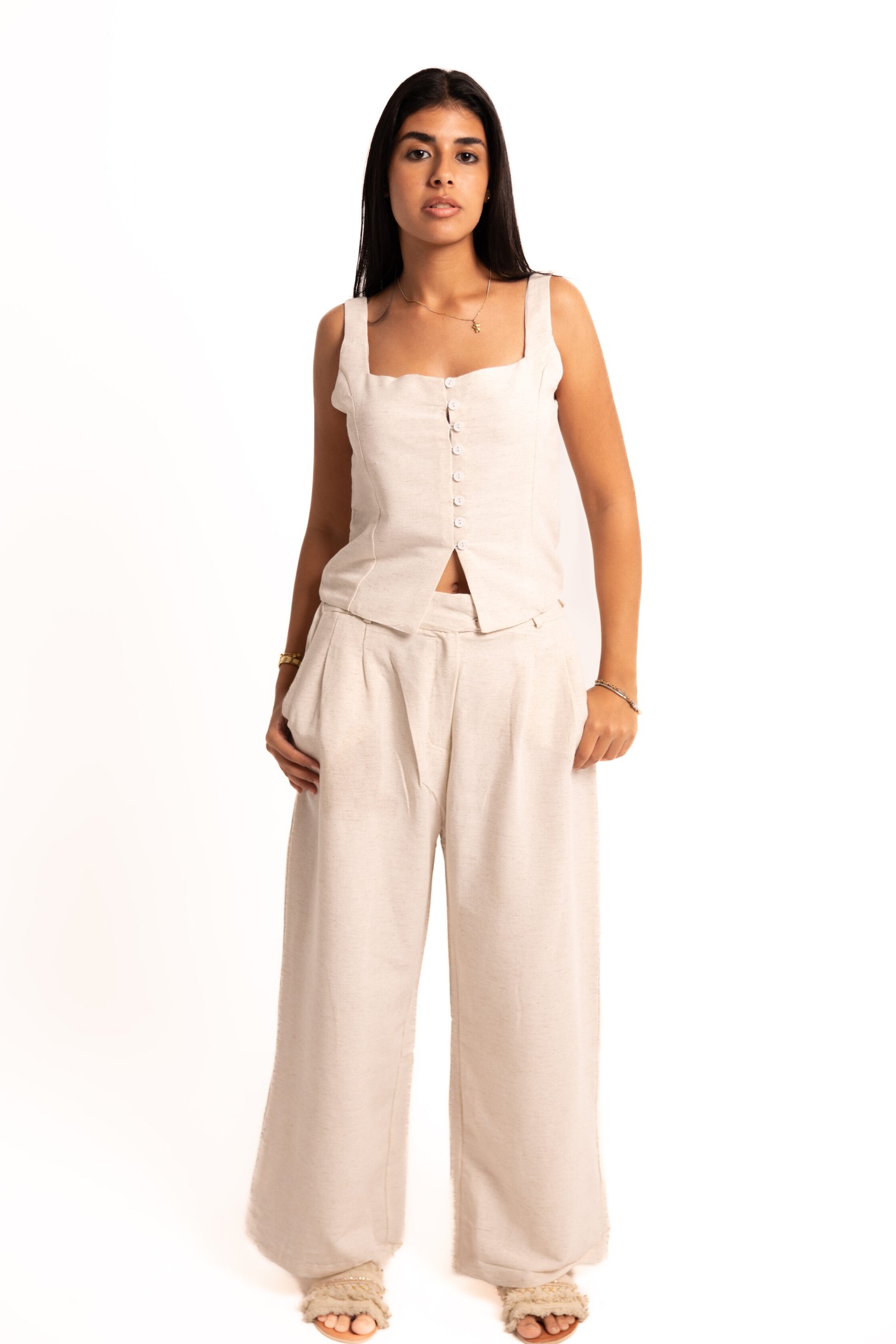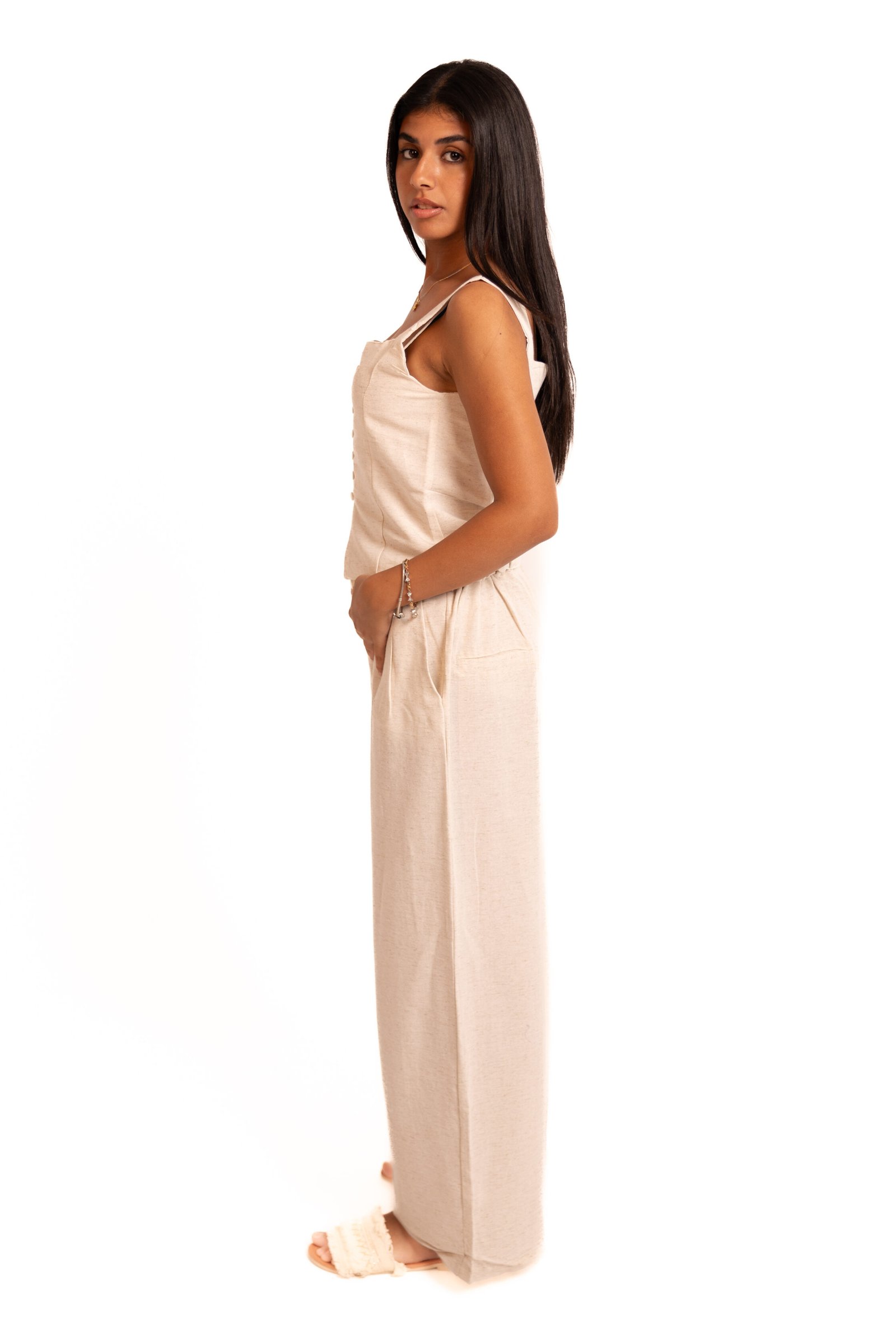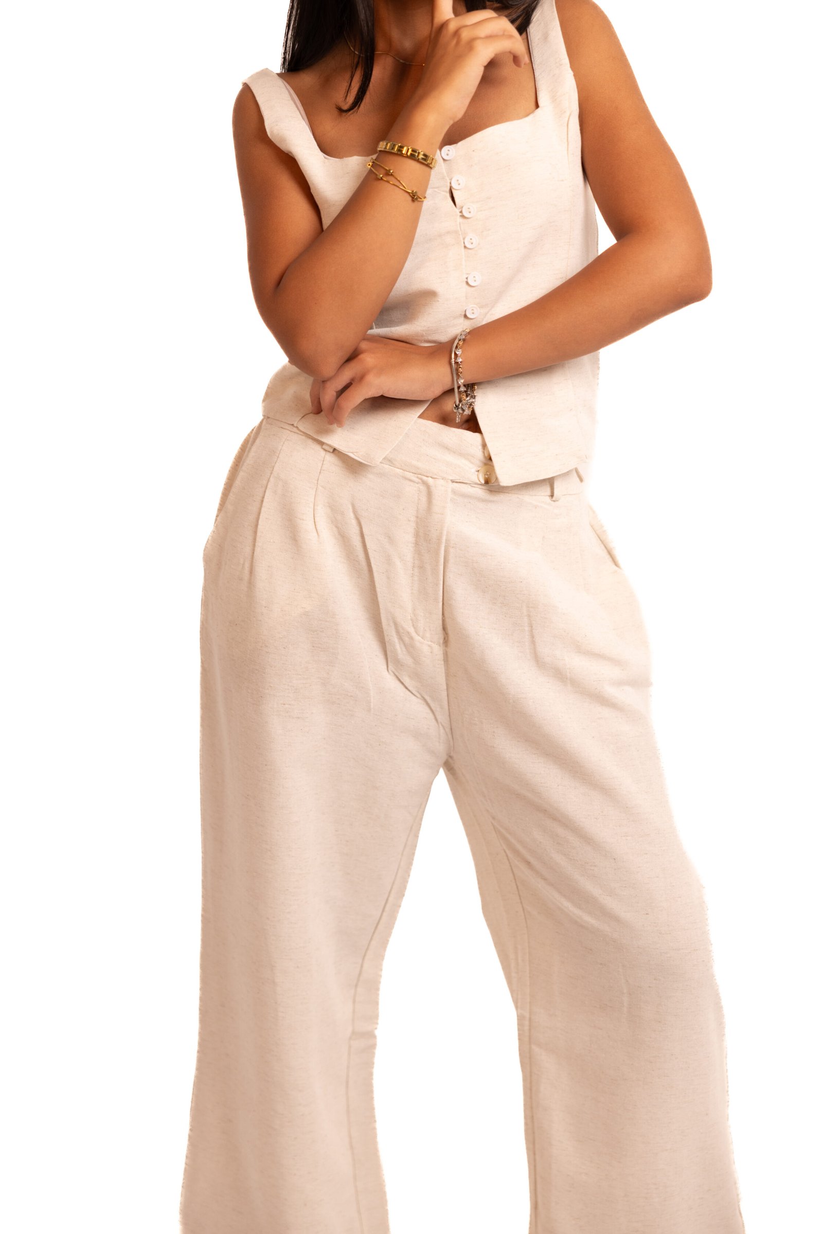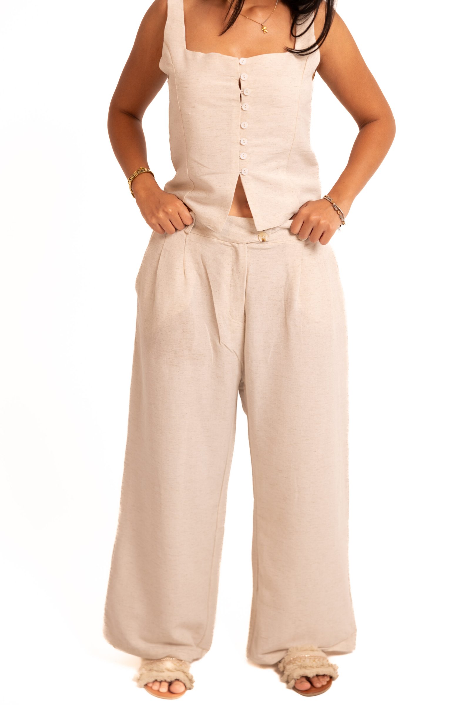 - Isla Linen Set in Beige ; Warm beige linen with an easy, feminine fit.