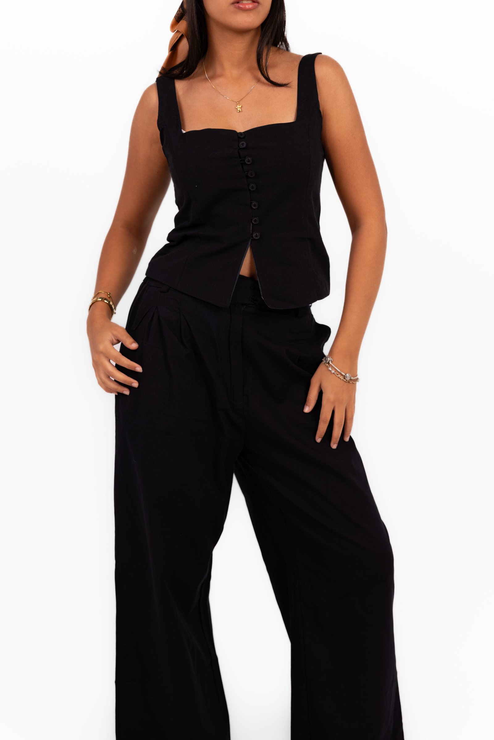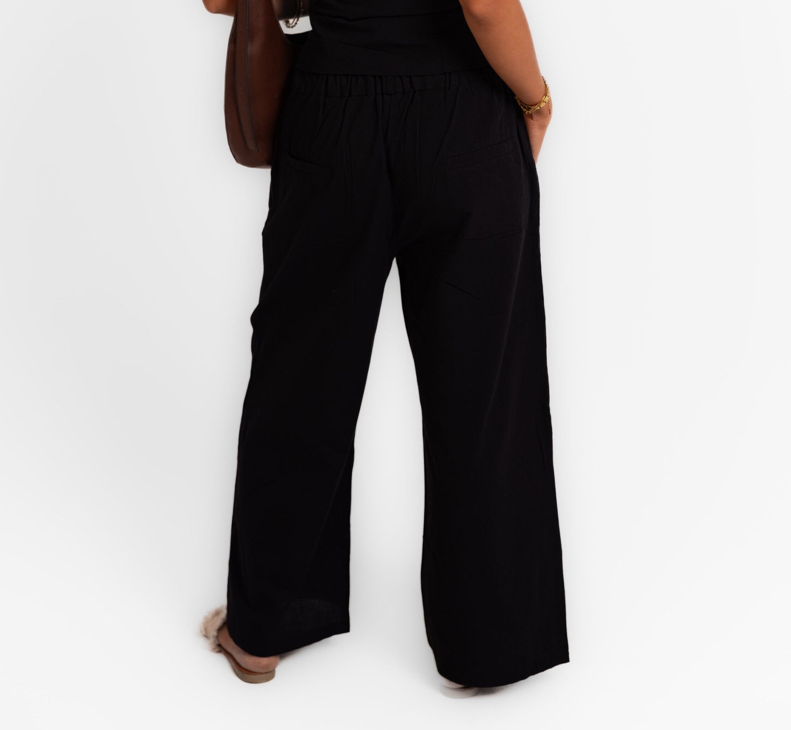 - Isla Sunset Black Linen Pants ; Black linen pants with a relaxed, easy fit
