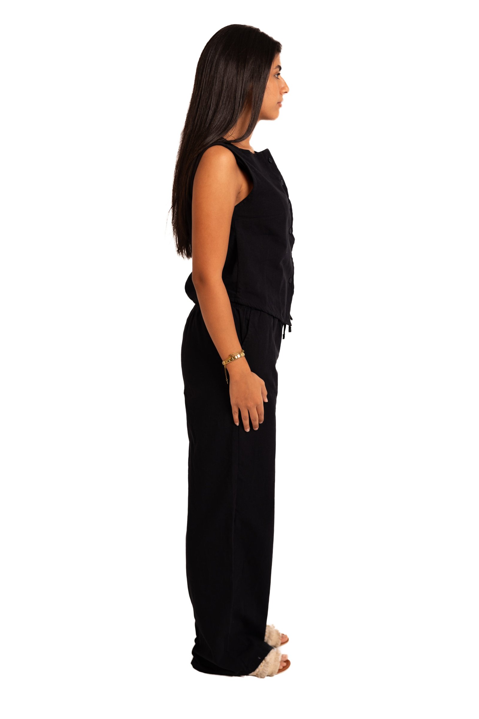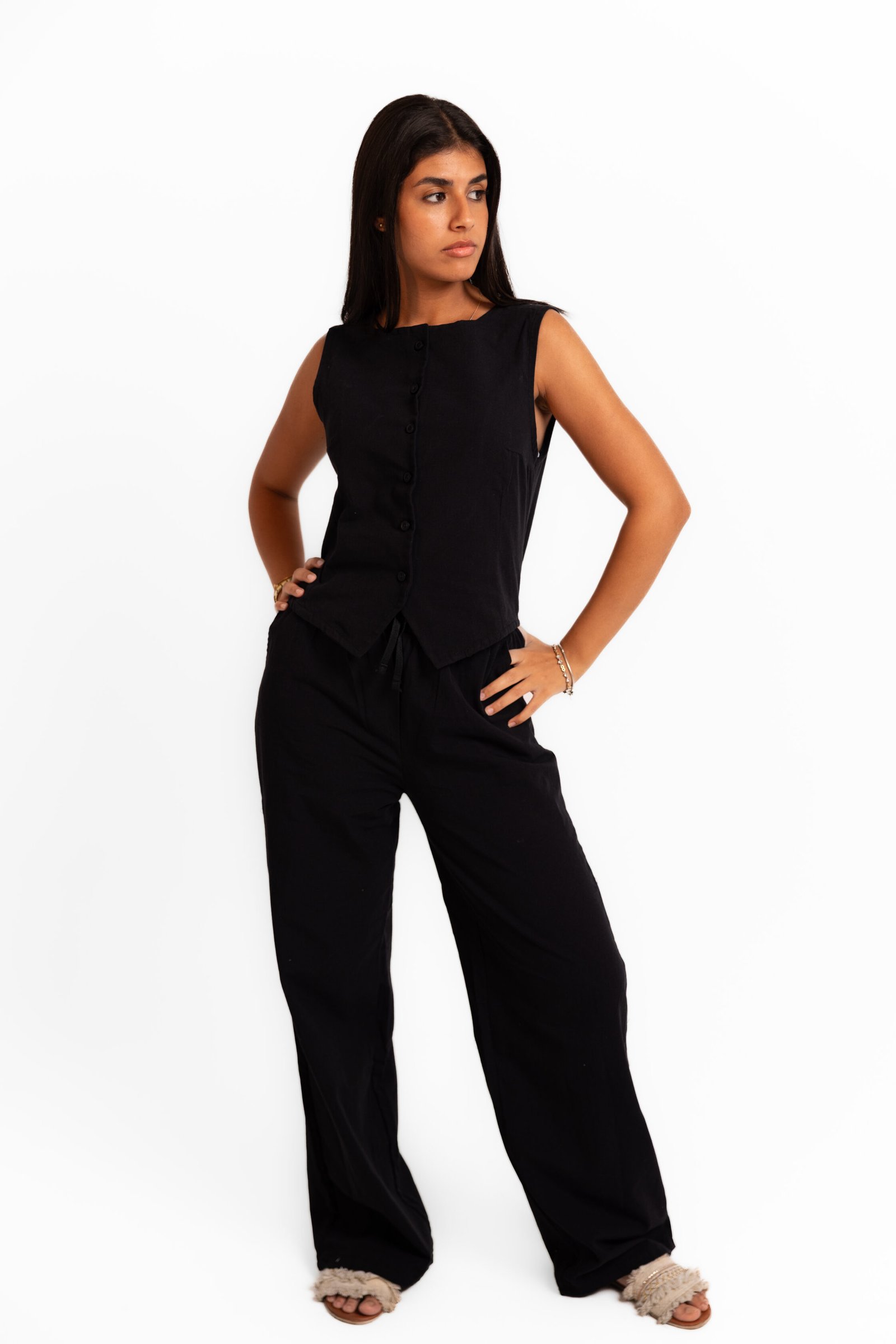 - Naya Linen Set in Black ; Minimal black linen that works with anything.